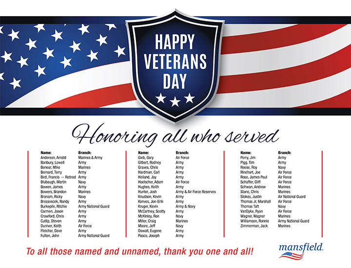 Veteran’s Day has special meaning at Mansfield Plumbing. It’s a day to honor 49 employees in the company who have served more than 300 combined years in the United States military.